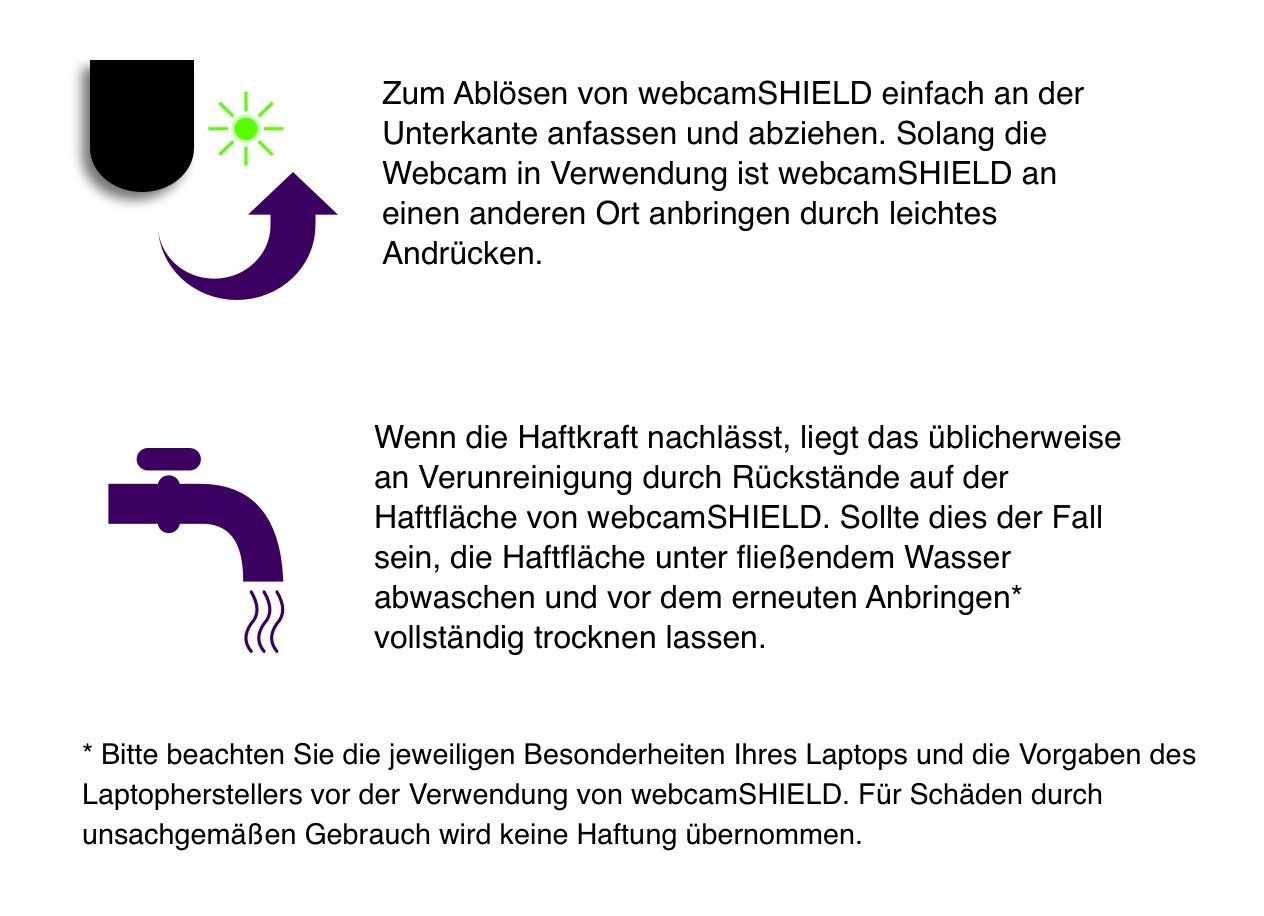 * Bitte beachten Sie die jeweiligen Besonderheiten Ihres Laptops und die Vorgaben des Laptopherstellers vor der Verwendung von webcamSHIELD. Für Schäden durch unsachgemäßen Gebrauch wird keine Haftung übernommen.