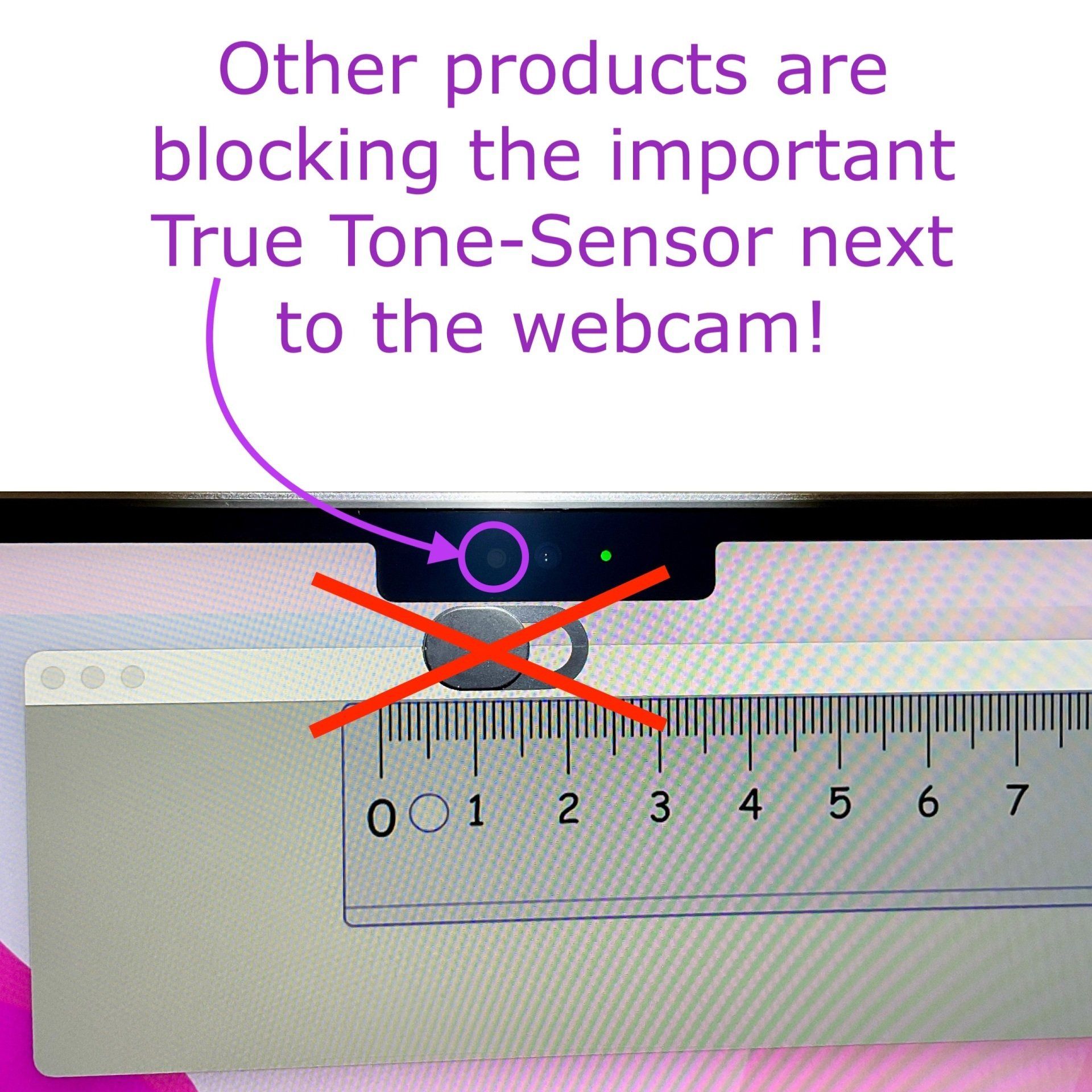 webcamSHIELD ist bewusst filigraner, kleiner und dünner als andere Kamera-Abdeckungen, da der Bauraum bei neuen Laptops immer kompakter wird. Daher erfordert das Platzieren etwas Feinmotorik - aber der Vorteil davon ist, dass nur die Webcam selbst blockiert ohne wichtigen Bauteile links und rechts davon (Helligkeitssensor / True Tone-Sensor 🟠und Status LED 🟢).