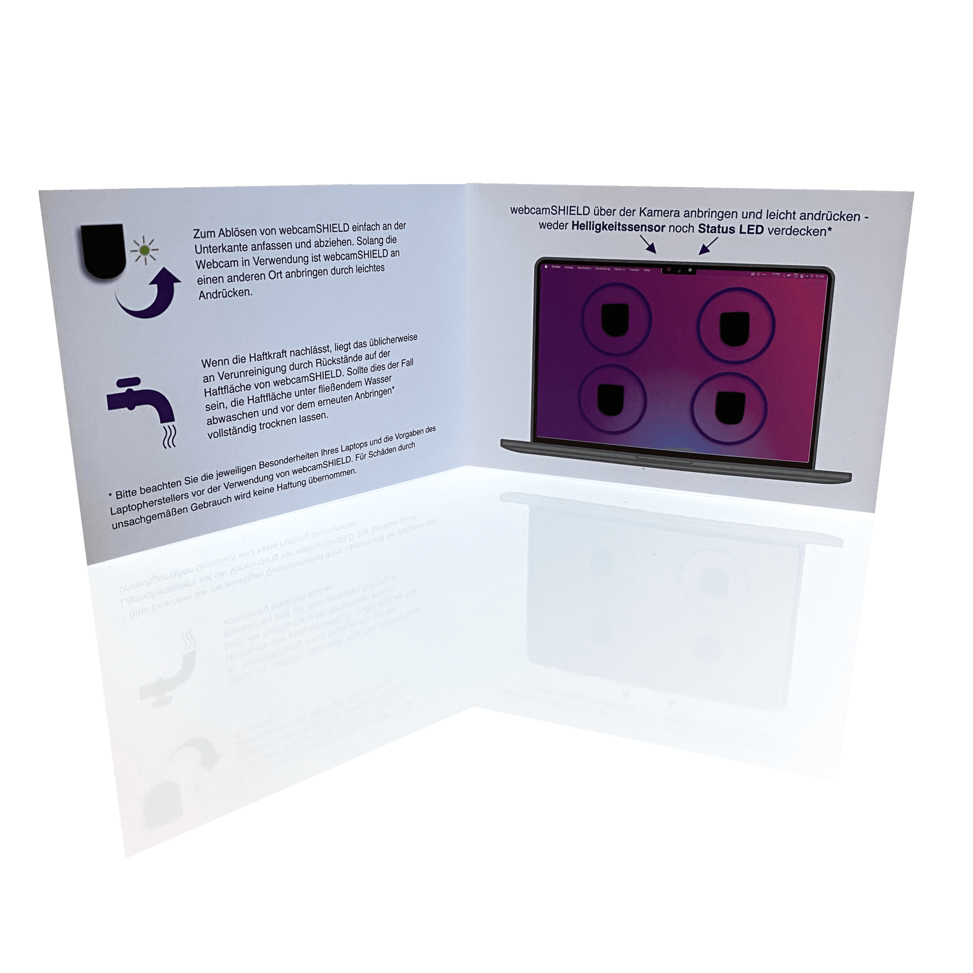 *Please check the specifications of your laptop and the manufacturer’s guidelines before using webcamSHIELD. No liability is assumed for damages caused by improper use. webcamSHIELD should not be bent as it can affect its appearance.