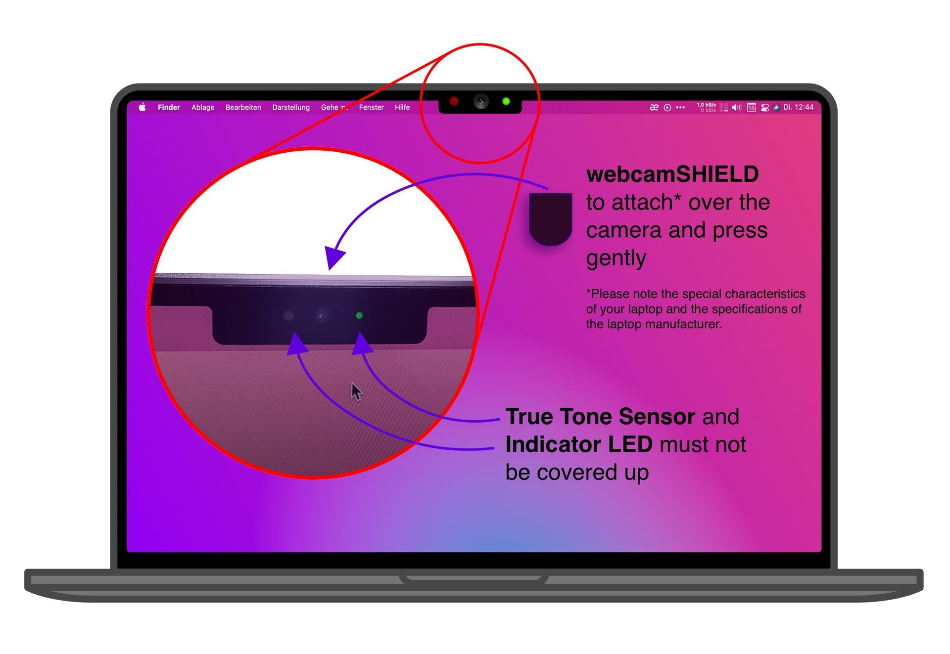 webcamSHIELD is deliberately more filigree, smaller and thinner than other camera covers, since the installation space in new laptops is becoming more and more compact. Therefore, placing it requires some fine motor skills - but the advantage of this is that only the webcam itself is blocked without the important components to the left and right of it, especially on MacBooks (brightness sensor / true tone sensor 🟠and status LED 🟢).